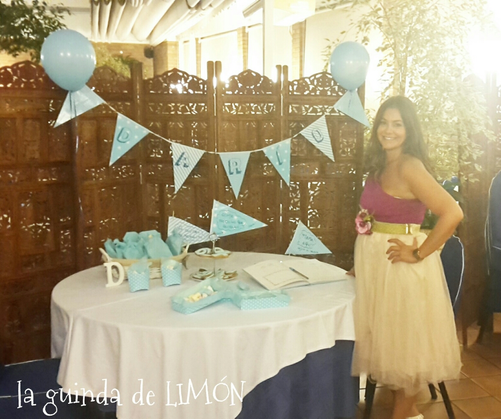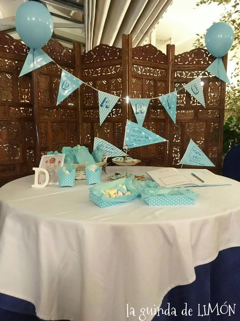 La decoración fue muy sencilla, guirnalda, globos y cajitas azules para guardar todas las cositas y su libro del bebé para que los asistentes le escribieran.