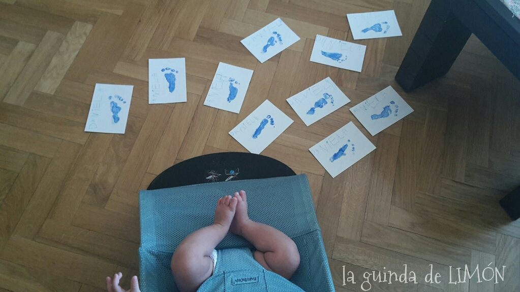 Una vez impresas Daniela las firmó escribiendo su nombre y Darío con la huella de su piececillo, y la regalamos con una pinza porta fotos.