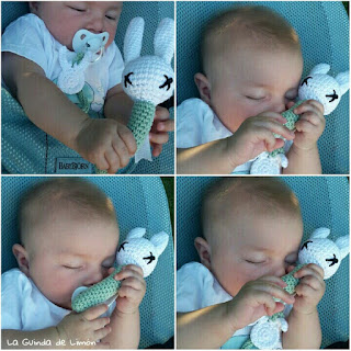 Cuando le presenté a #ConejoBlanco a mi pequeño, lo cogió fácilmente, se lo puso en la carita y se durmió. Tiene un soniquete de cascabeles que le ayudó a relajarse.